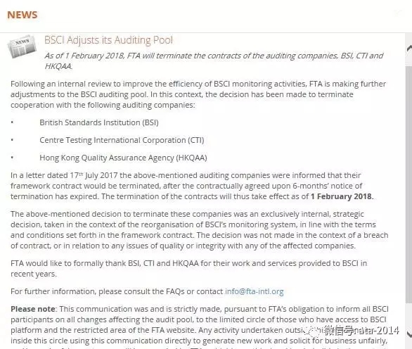 近期经BSCI研究慎重决定再次砍掉三家审核机构,合同终止时间2018年2月1日,估计这段时间这三家机构开始疯狂放单咯,回光返照即将来临。