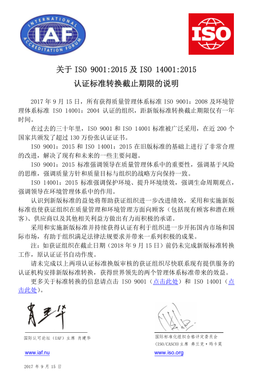 两位主席在联合倡议中指出,ISO 9001:2015和ISO 14001:2015在旧版标准的基础上进行了非常合理的改进。采用和实施新版标准并持续获得认证有利于组织满足法律法规要求,进一步开拓国内和国际市场,并带来一系列积极的成果。请未完成认证标准换版审核的获证组织尽快安排新版标准转换,获得世界领先的两个管理体系标准带来的效益。